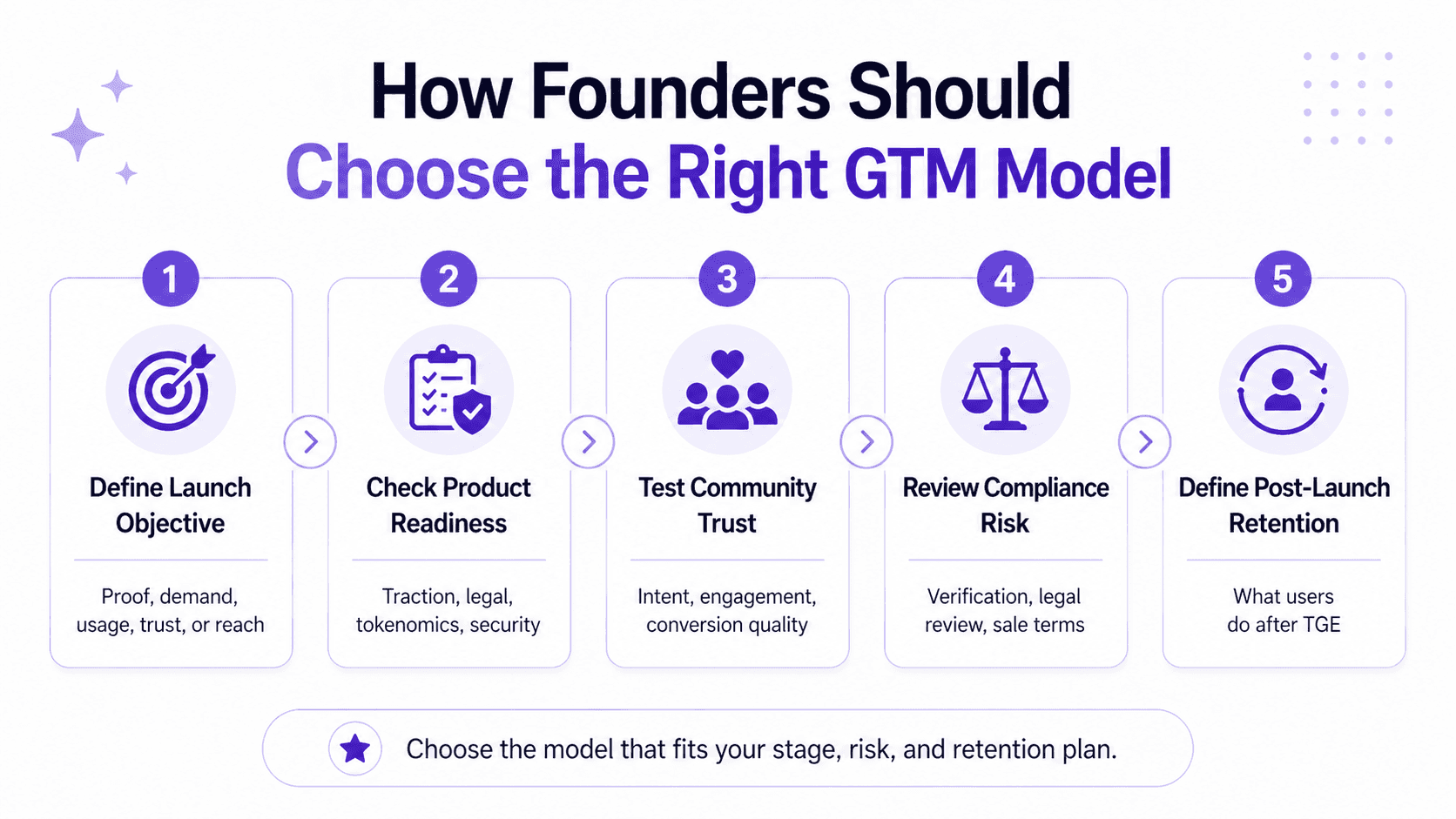 Each GTM model should be compared against the launch objective. The right model depends on more than reach. It also depends on capital access, community formation, user activation, fairness risk, compliance pressure, and post-launch retention.