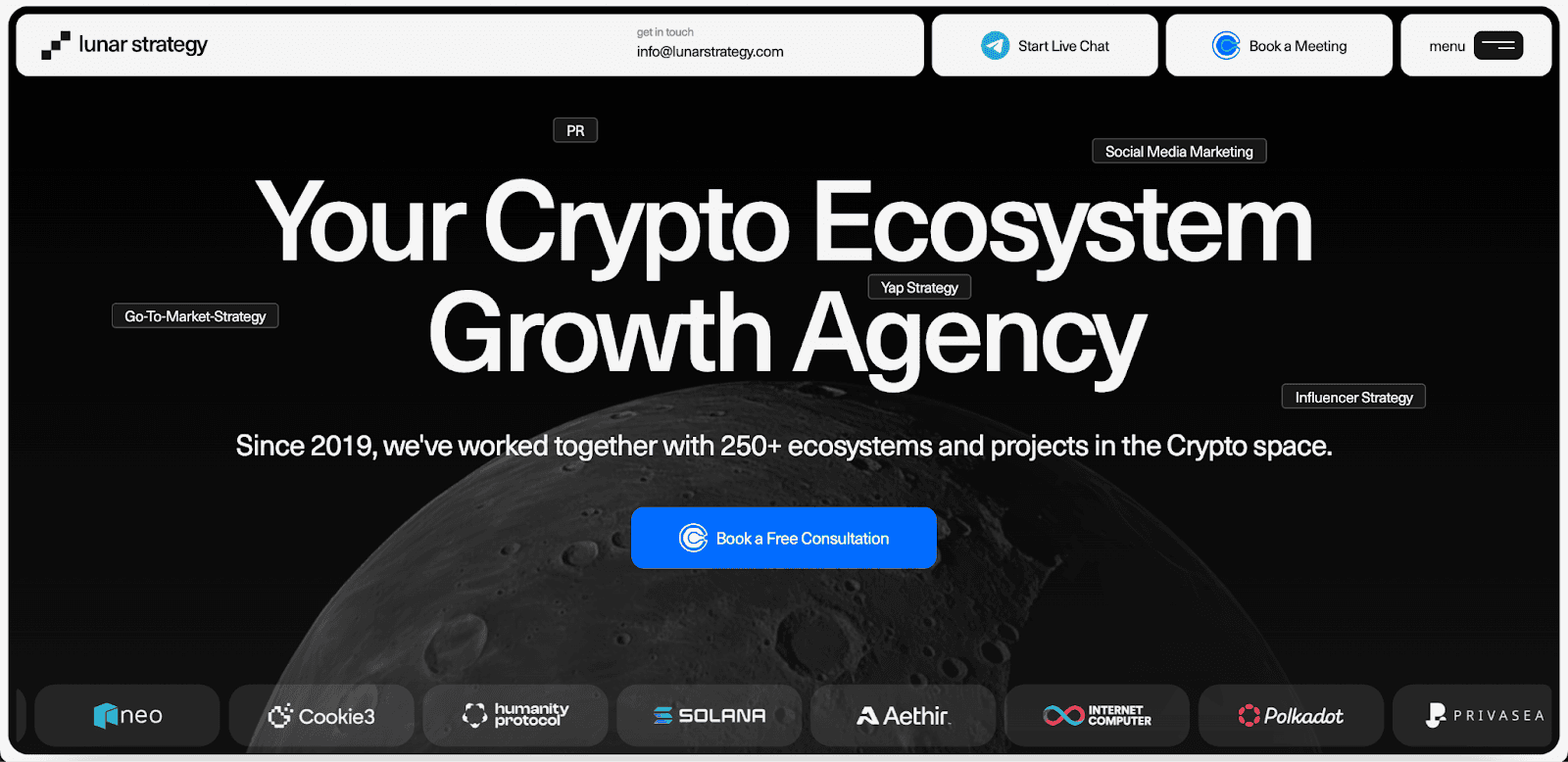 Lunar Strategy stands out through its pre-TGE focus. It works closely with early-stage Web3 ecosystems, including L1, L2, DeFi, and DePIN projects. Its offer centers on community building, positioning, partnerships, and launch readiness.