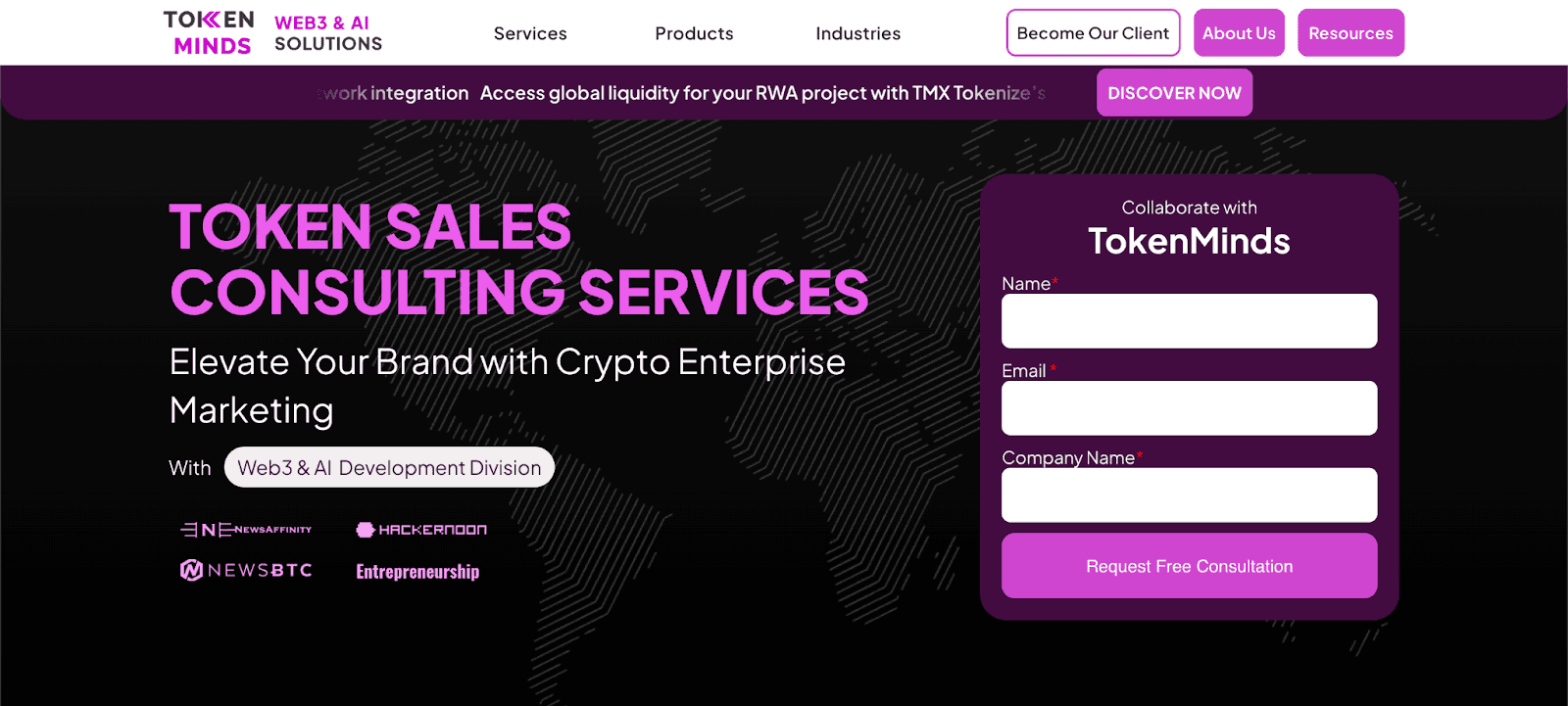 TokenMinds | $10,000+ | Token sale strategy and launch support (including narrative creation, tokenomics, full stack, crypto marketing, and post launch support) | Finance institutions and enterprises, including banks, PSPs, neobanks, and wallet providers |