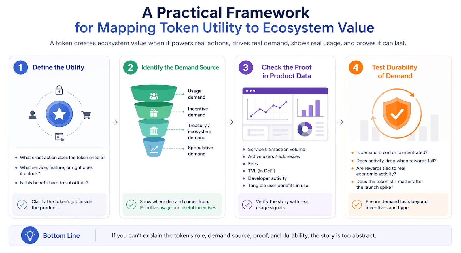 A token creates stronger ecosystem value when four things are clear. The team should explain what the token does, why users need it, what data supports that demand, and whether that demand can last beyond launch incentives.