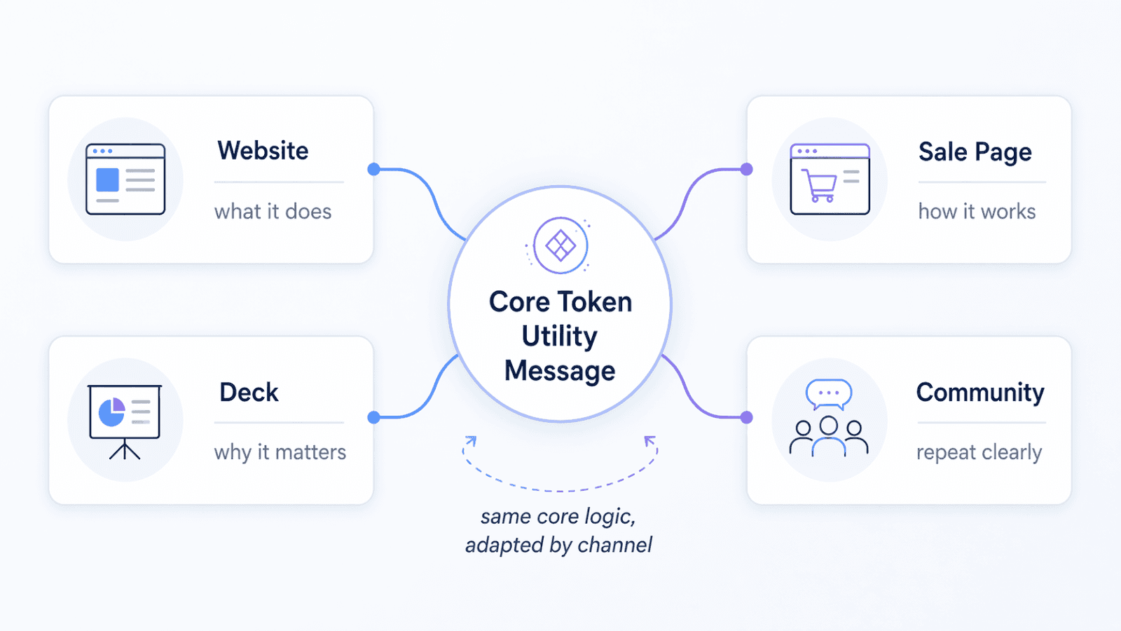 The website may explain utility. The deck may focus on supply. The community may push hype. The sale page may ignore user flow. That breaks trust because the token no longer has one clear role across the launch story.