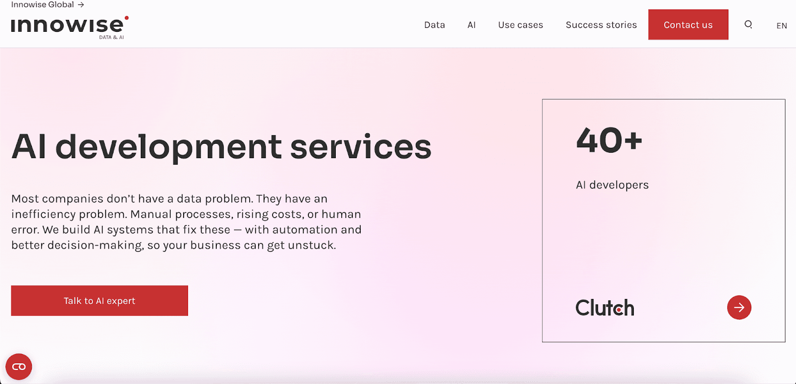 The company also shows strong industry coverage. It works across retail, finance, healthcare, manufacturing, logistics, and energy. That makes it easier to position Innowise as a partner for firms that need both AI engineering and data operations support after launch.