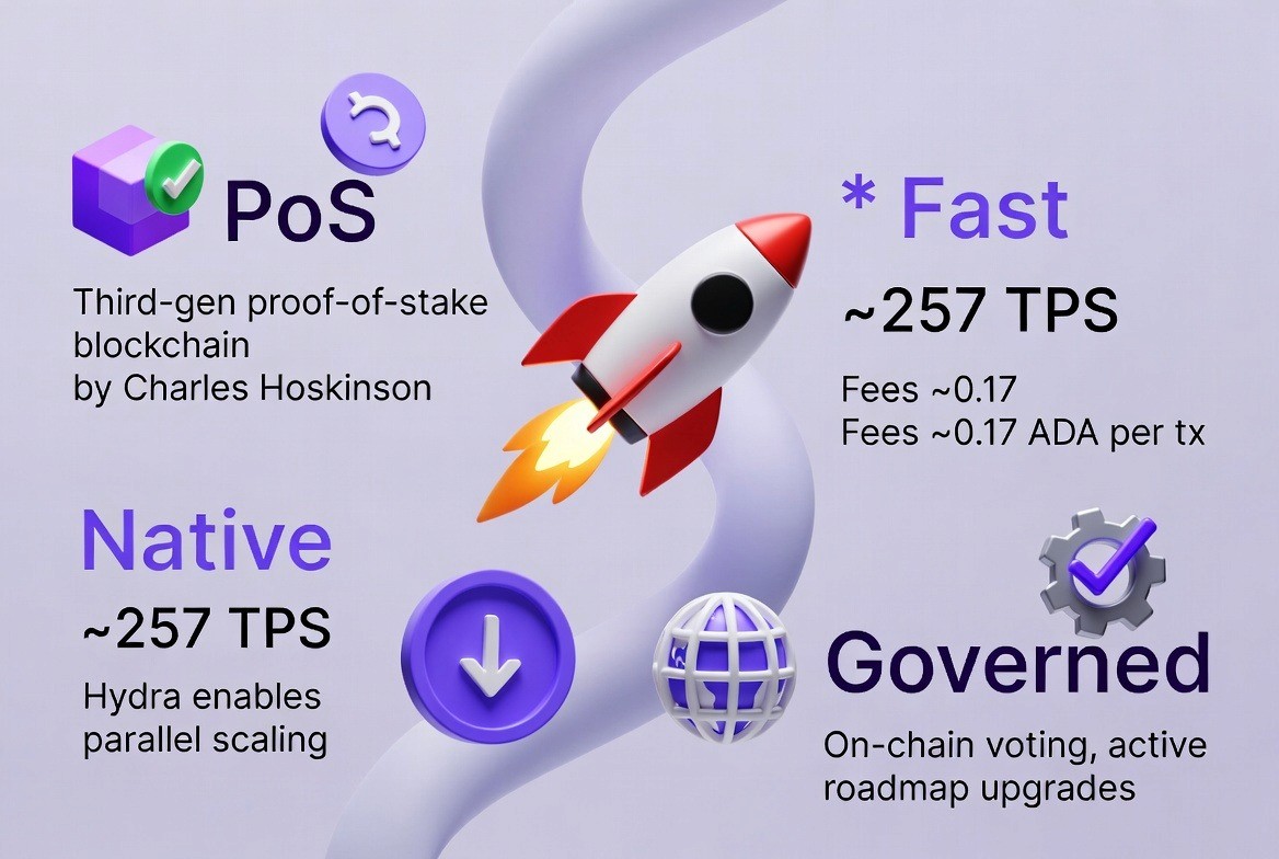 Throughput: Cardano handles 257+ TPS. Hydra, its Layer 2 solution, is designed for thousands of parallel off-chain transactions.