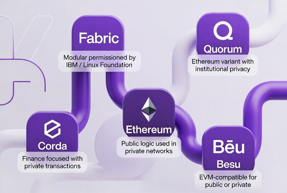 Hyperledger Fabric: Open-source, modular, permissioned. Built by IBM and the Linux Foundation. Used in finance, supply chain, healthcare, and government.