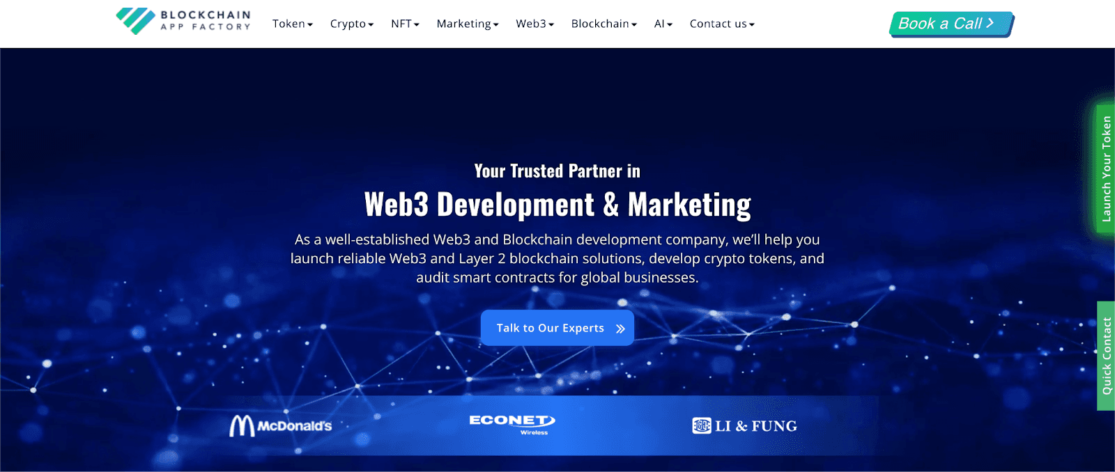 Blockchain App Factory offers a wide Web3 execution range around Ethereum. Its scope includes smart contracts, dApps, audits, token sales, and RWA. The firm also supports Layer 2 builds and launch support. That breadth helps teams combine product delivery with go-to-market work. It fits launch-focused projects wanting one vendor across several stages.