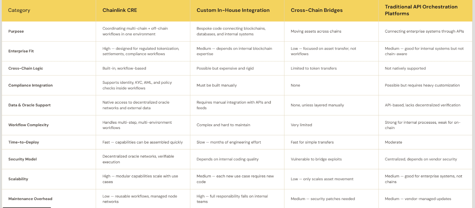 Chainlink CRE solves many of those problems. It provides a single layer at runtime, enabling businesses to run smart contracts on multiple blockchain systems and legacy systems. It also automates data tasks, workflow and compliance, enabling teams to work faster and safer.
