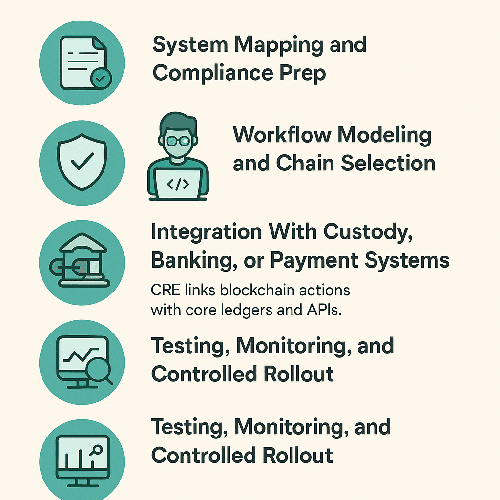 Teams review current data flows, KYC rules, asset workflows, and ISO 20022 messaging. CRE modules are matched to each requirement.