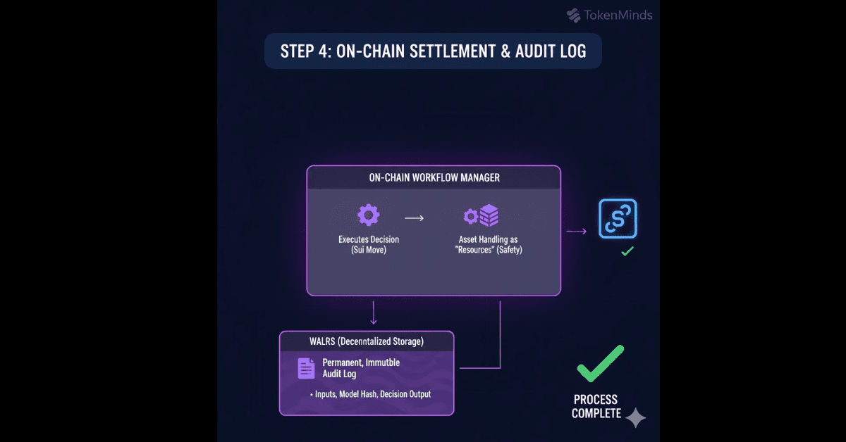 Once the transaction reaches Sui, the Workflow Manager carries out the instruction in a predictable, rule-based manner. Assets are handled using Sui Move’s resource-oriented model, which prevents accidental duplication or unintended destruction of funds. In parallel, the system stores the full decision record—inputs, model version, and final output—in Walrus, creating an immutable audit trail for later review or compliance reporting.