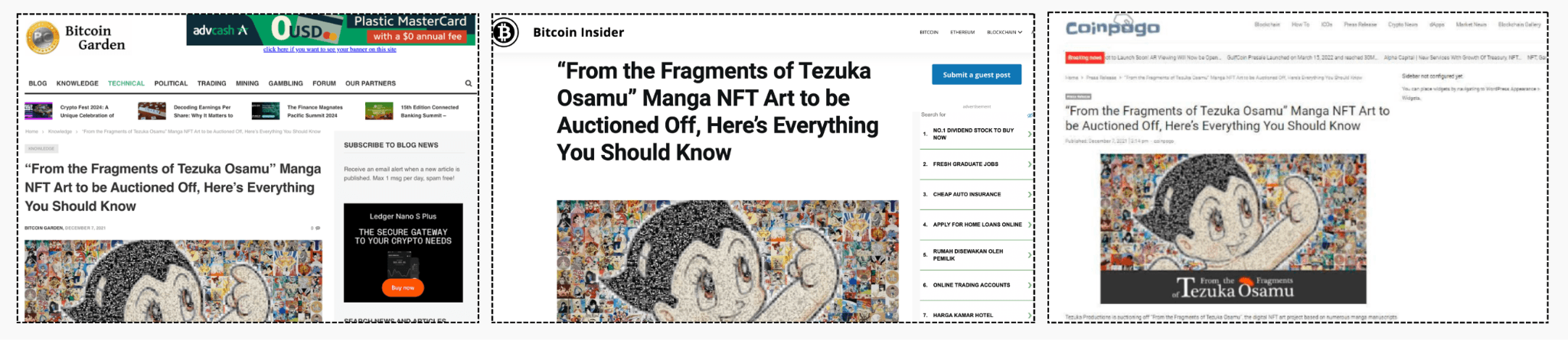 Articles were strategically published across top-tier crypto and art media, targeting both NFT collectors and art enthusiasts. The campaign emphasized the cultural value of digitizing Tezuka Osamu's iconic manga art, preserving traditional art through blockchain technology.